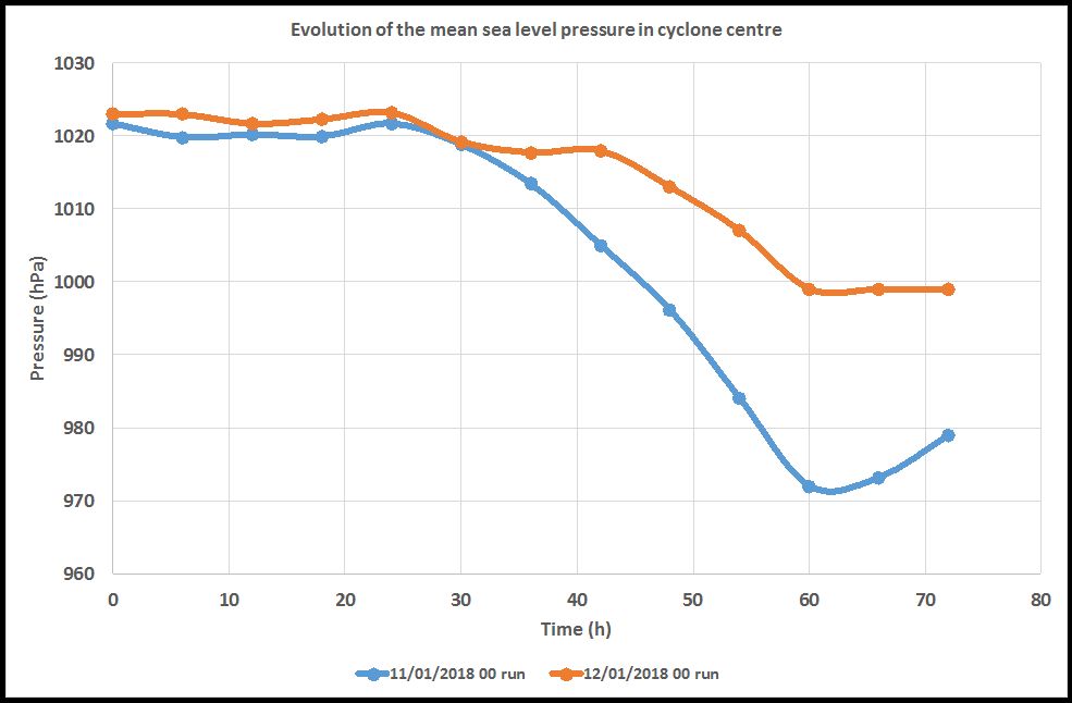 Figure 6.2: Development of mean sea level pressure (hPa) at the centre of the cyclone from 16 January 2018 00 UTC (0 h on the time-axis), for the ECMWF runs starting 11 January 2018 00 UTC (blue curve) and 12 January 2018 00 UTC (orange).