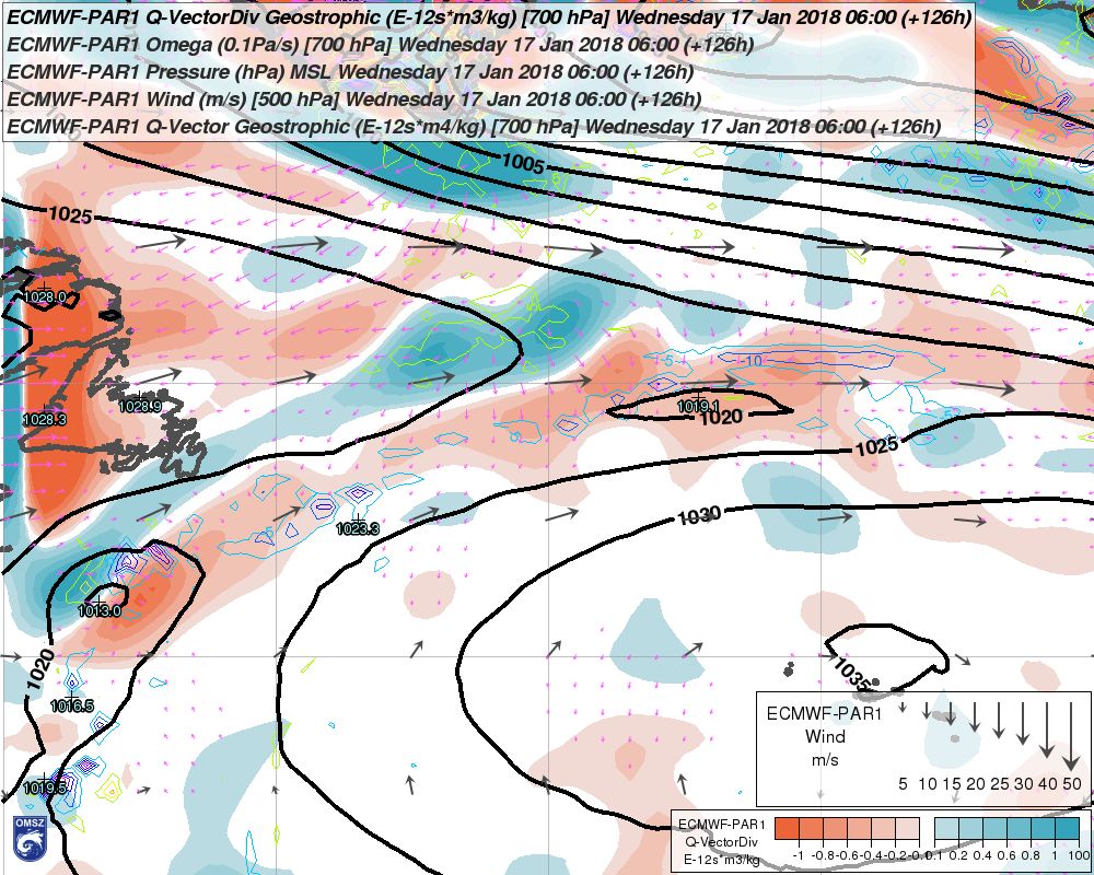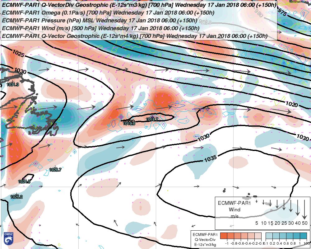 Figure 6.3: a) Left: ECMWF 150 h forecast of mean sea level pressure (hPa, lines), Q-vector divergence at 700 hPa (shades, 10-12 m3s/kg), Q-vector (small magenta vectors), omega velocity (coloured lines, Pa/s) and 700 hPa wind (large vectors, m/s) from the 11 January 2018 00 UTC run.