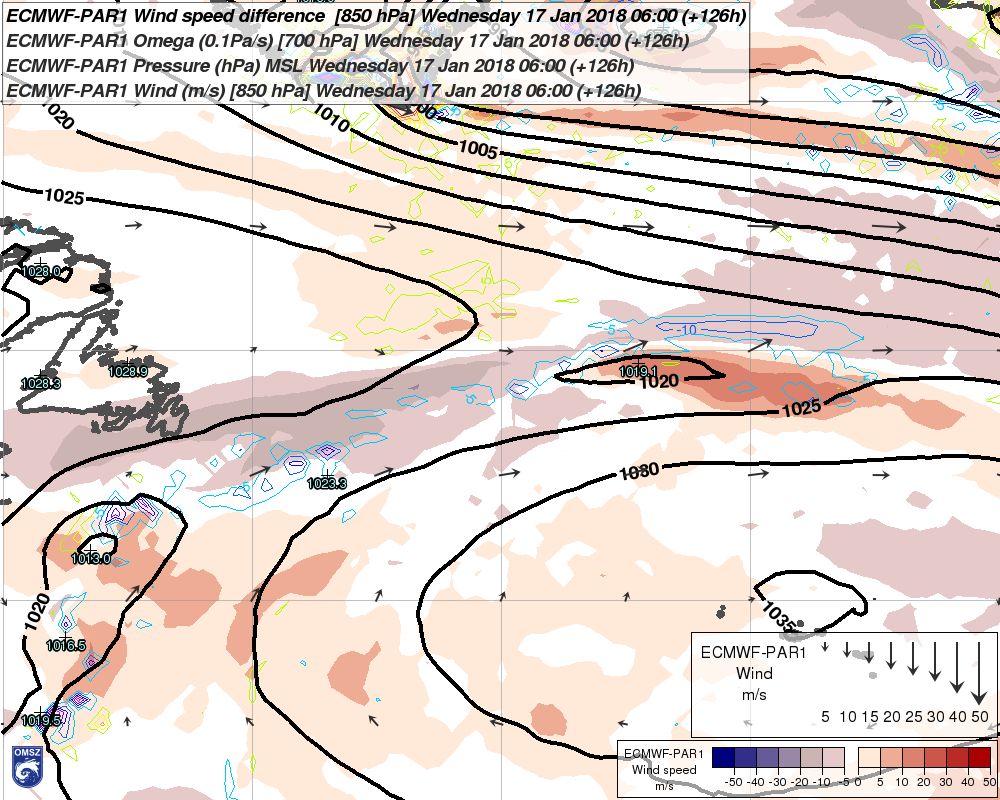 Figure 6.4: Difference in the 850 hPa wind speed (colour shades, m/s) between the 12 January 2018 00 UTC and 11 January 2018 00 UTC runs; mean sea level pressure (hPa, thick lines), omega vertical velocity (coloured lines, Pa/s) and 850 hPa wind (vectors, m/s), for the 126 h forecast of the 12 January 2018 00 UTC run, valid for 17 January 2018 06 UTC.