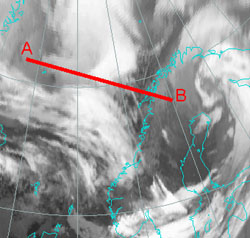 In this chapter, relevant parameters are presented in a vertical cross section for an initial (1st March 2004:06 UTC) and an end stage (2nd March 2004:12 UTC). The main question of interest is if there are frontal characteristics from the very beginning or only later or not at all. To have a common nomenclatur is the system under consideration in the whole case study called “the growing cloud spiral”.