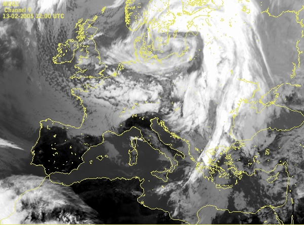 Cloud spiral over Baltic sea is connected with deep low. Cloud structure west of Great Britain indicates cold advection from north down to the South-west England and North-west France. In the Mediterranean some low clouds are present, and the Genoa Bay and North Italy are almost cloudfree zone.