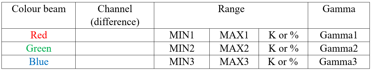 This description explains how to create the EUMETSAT-suggested standard RGB scheme. The table below contains the required parameters for an RGB scheme.