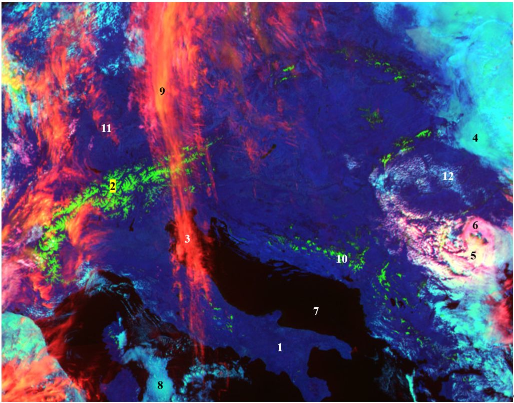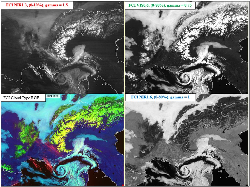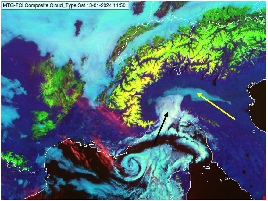 Fig. 8.2: MTG FCI Cloud Type RGB, 13 January 2024, 11:50 UTC. The images are created from preliminary commissioning data. (Credit to EUMETSAT)
