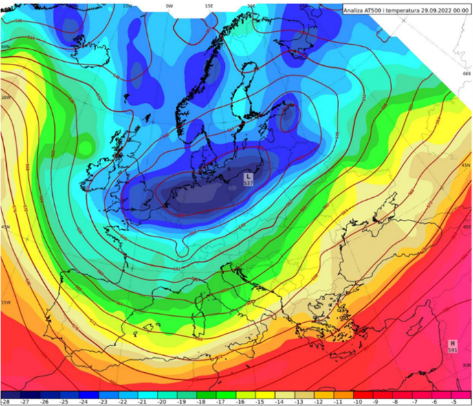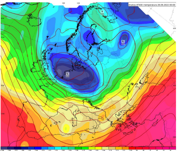Figure 4: ECMWF geopotential height analysis charts: - AT500 (lines) and temperature (°C) at 500 hPa isobaric surface (colour shades) for 28 (left) and 29 September (right) 2022, at 00:00 UTC.