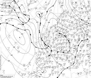 Figure 5: Surface pressure charts and frontal analysis, 28 September 00:00 UTC (source: DWD).