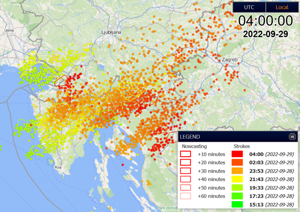Figure 6: Lightning during the period from 28 September 2022 at 15:00 local time to 29 September 2022 at 04:00 local time. It is possible to follow the path of cells from the southwest to the northeast of Croatia. Source: nowcast GmbH.