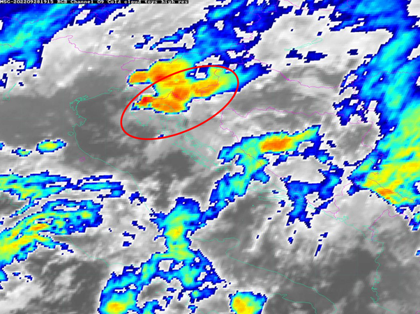 Figure 7: Meteosat-11 satellite image in the infrared part of the spectrum (IR 10.8 µm). Colours indicate temperature (from 200 K (dark red) to 240 K (blue)), on 28 September 2022, 19:15 UTC (21:15 h local time). Circled in red are convective cells over western Croatia. (Source: EUMETSAT).