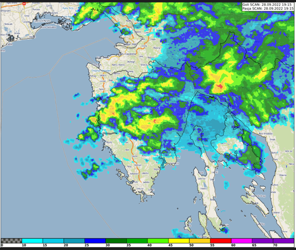 Figure 8: Composite radar image from radars at Goli (Istria, Croatia) and Pasja Raven (Slovenia) showing the radar reflectivity in dBz, on 28 September 2022 at 19:15 UTC.