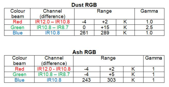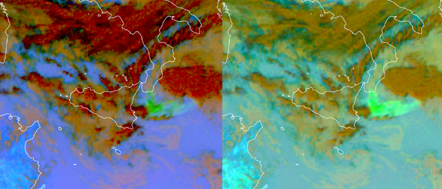 Some RGBs work better for monitoring a certain phenomenon at high latitudes than those that are usually used to monitor the same phenomenon at lower latitudes such as in the Mediterranean area. An example of this is monitoring volcanic ash. Usually, the Ash RGB is most appropriate for monitoring the movement of ash and SO2 plumes. However, it is advised that in high latitude regions the Dust RGB should be used for monitoring volcanic ash. For example, at high satellite viewing angles SO2 clouds are easier to distinguish in the Dust RGB. Recipes for the two RGBs are shown in Figure 21. In Figure 22 the Dust RGB provides better color contrast between an SO2 plume and the lower-level clouds. This is due to the different temperature ranges used for the green component in the two RGBs: the green component for both is IR10.8-IR8.7, and IR8.7 is more sensitive to the slanted angles than IR10.8 so that the difference between SO2 plume and low-clouds becomes clearer using the temperature range used in the Dust RGB. Looking again at Figure 22 it can be noted that the contrast between the SO2 plume and water clouds is small in the Ash RGB. In Figure 23 the green beam components for the two RGBs are shown and the larger contrast between the plume and lower clouds is evident in the green component of the Dust RGB.