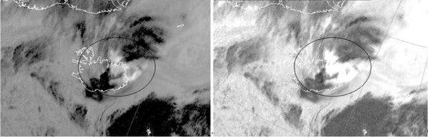 Figure 22: Volcanic eruption in Iceland, SO2 gas plume. Dust RGB (left), Ash RGB (right) for 22 May 2011, 06:55 UTC