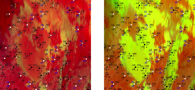 Figure 25 shows an example of a very cold weather situation, which leads to an attenuated signal even from low level clouds when looking at the Night Microphysics RGB. This is because very small changes in detected radiance at cold temperatures cause very large changes in the 3.9 µm brightness temperature. The 3.9 µm band lacks precision compared to the other window channels, such as 10.8 or 8.7, for very cold temperatures. In the Night Microphysics RGB the green component is set to be IR10.8-IR3.9 whereas in the 24-hour Microphysics RGB it is IR10.8-IR8.7.