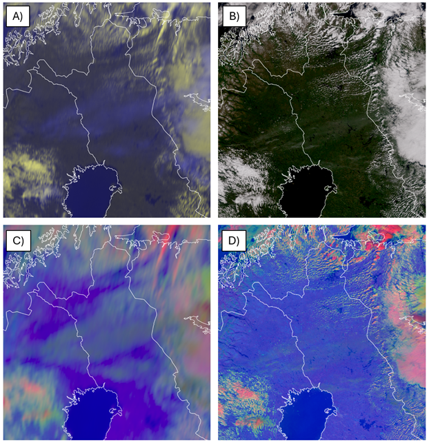 Figure 20: Comparison of cirrus clouds over Finnish Lapland, 27 June 2024 for different satellite products: A) SEVIRI HRV Clouds RGB, 10:15 UTC B) VIIRS True Color RGB, 10:16 UTC C) SEVIRI Day Microphysics RGB, 10:15 UTC and D) VIIRS Day Microphysics RGB, 10:16 UTC.