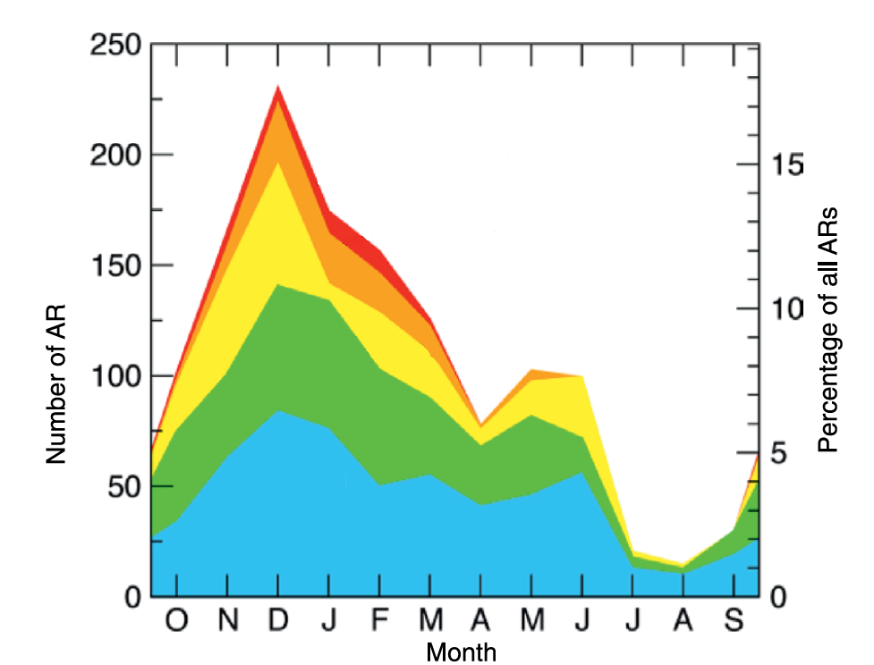 We observe more ARs in the winter season [2][3], when cold air troughs extend more frequently to lower (tropical) latitudes (Figure 11) and then bring warm, moist air masses towards the poles.