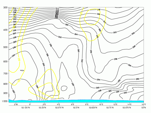 There is a maximum of the isotachs near the surface. The axis perpendicular to the cross section. This is the area of strong northern winds on the western side of the surface low, which was registered as heavy storms on the west coast of the Netherlands.